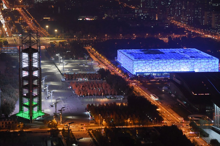 Picture taken with drone on Oct. 28, 2021 shows an aerial view of National Aquatics Center (R). (Xinhua/Zhang Chenlin)