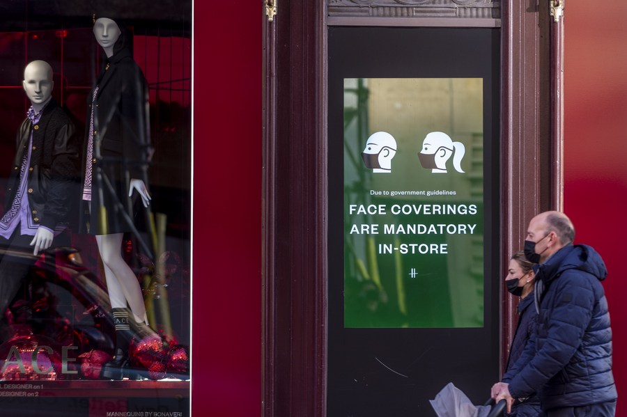 People walk past a sign requiring people to wear face coverings in London, Britain, on Dec. 9, 2021. (Photo by Stephen Chung/Xinhua)