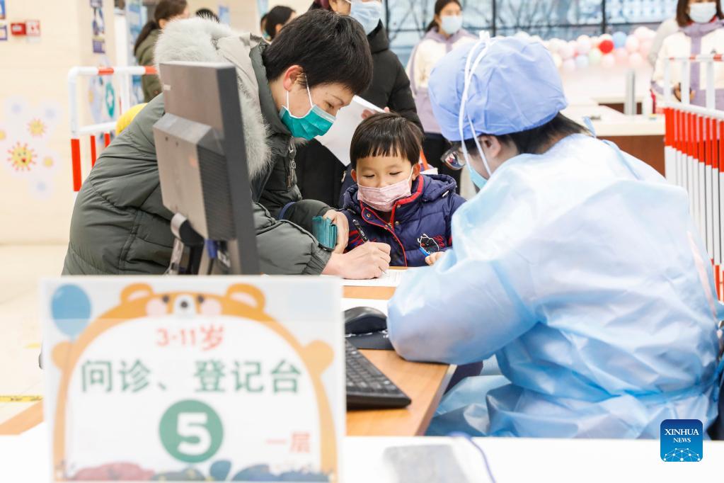 A medical worker registers information for a child before administering a dose of COVID-19 vaccine at a vaccination site in Beijing, capital of China, Dec. 9, 2021. As of 4 p.m. Wednesday, more than 2 million doses of COVID-19 vaccines had been administered in Beijing to the city's children aged between 3 and 11, local authorities said Thursday. Starting from Oct. 28, the Chinese capital began offering COVID-19 vaccination to children aged between 3 and 11. Nearly 1.37 million minors of this age group have been vaccinated. (Xinhua/Zhang Yuwei)