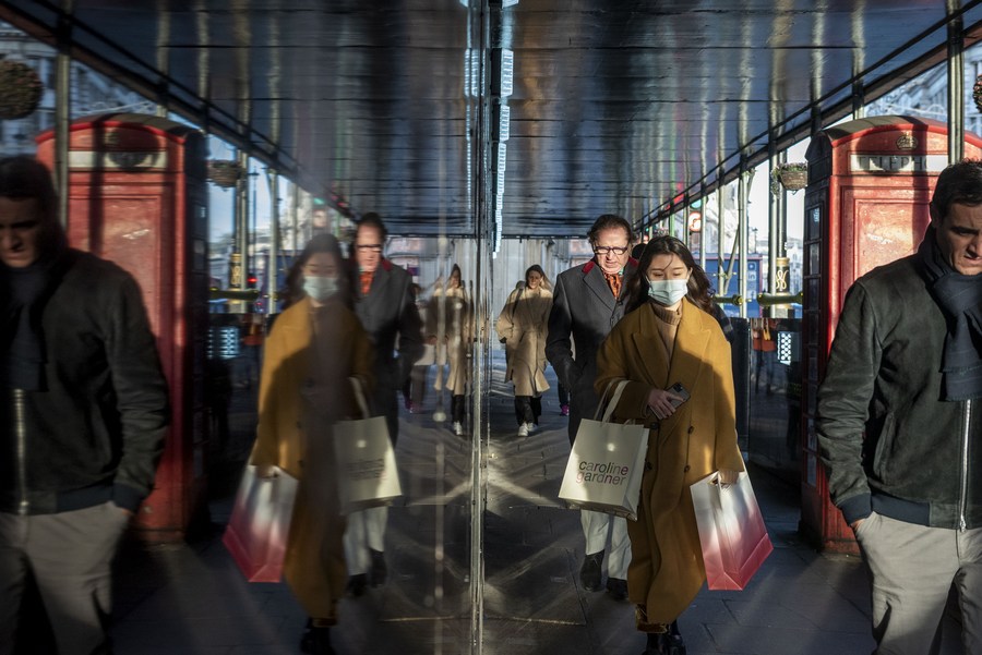 People walk on the street in London, Britain, on Dec. 9, 2021. (Photo by Stephen Chung/Xinhua)
