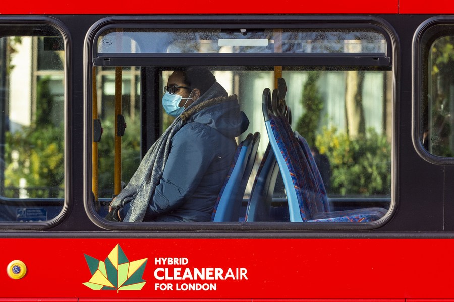 A passenger wearing a face mask is seen on a bus in London, Britain, on Dec. 9, 2021. (Photo by Stephen Chung/Xinhua)