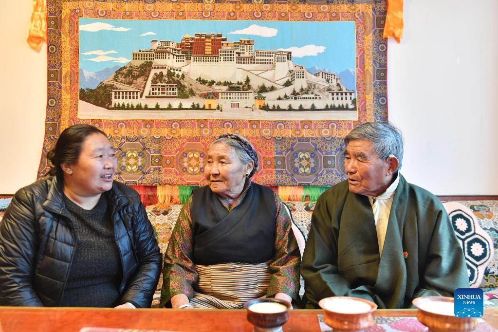 Thubten Gyaltsen (R) talks with his family in Xigaze, southwest China's Tibet Autonomous Region on May 11, 2021. Thubten Gyaltsen, 81, led a miserable life before the democratic reform in Tibet in 1959. His parents passed away because of heavy workload as serfs in his childhood. To make a living, Thubten started working for the rich at the age 13. "Being in rags and starvation was the most profound memory of my adolescence," he recalled. Thubten embraced a brand new life in 1959 when democratic reform was launched and feudal serfdom was finally abolished in Tibet. "The Communist Party of China has liberated us and we have finally stood up." said Thubten, a Party member who has served the people for three decades. Living with his family in a spacious house, Thubten is now enjoying a happy life. (Xinhua/Sun Ruibo)