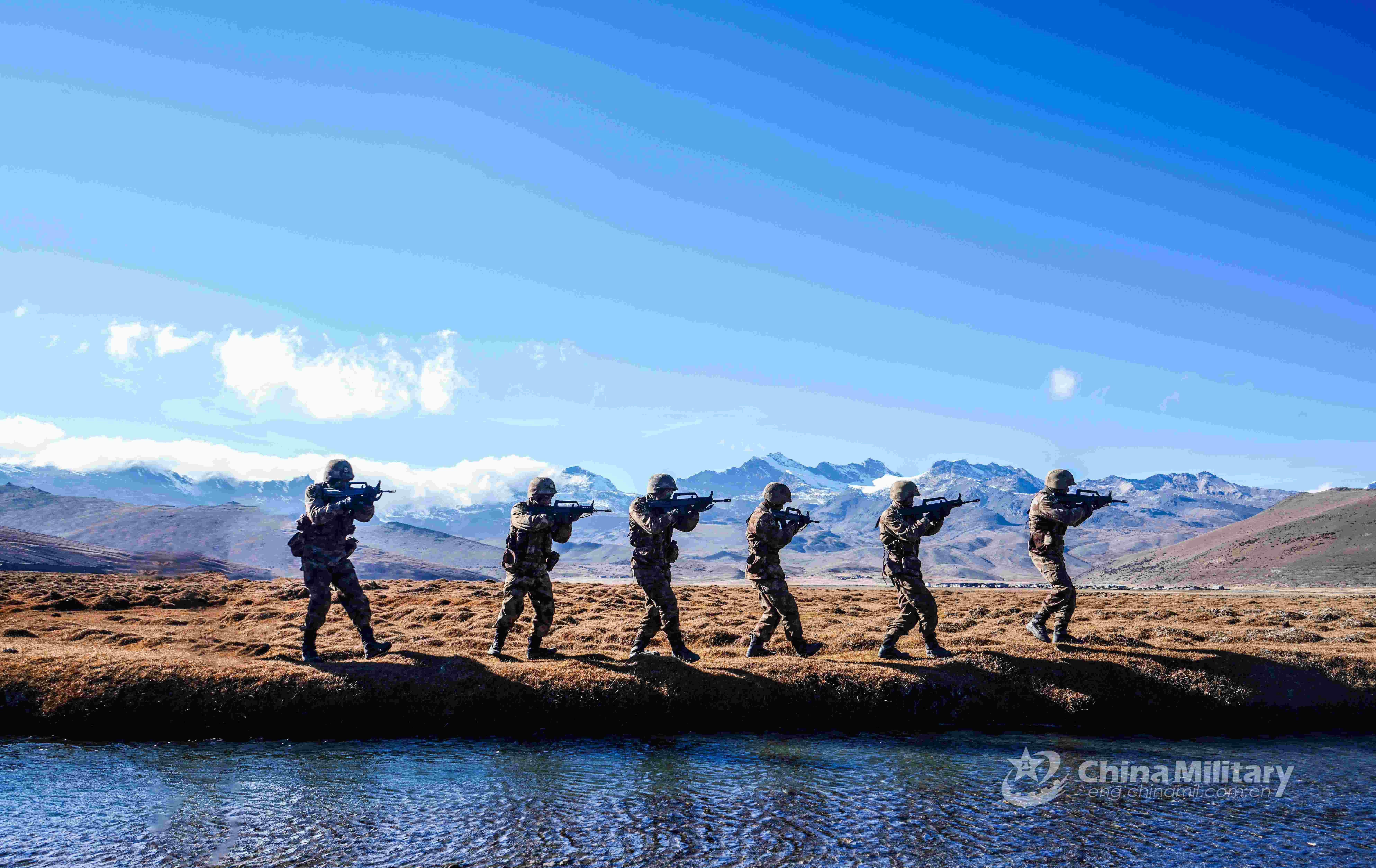 Soldiers assigned to a regiment under the PLA Xinjiang Military Command cover each other in firing position while marching in formation to engage in mock targets during an assault operation in mountainous region on November 8, 2021. (eng.chinamil.com.cn/Photo by Deng Xinyang)