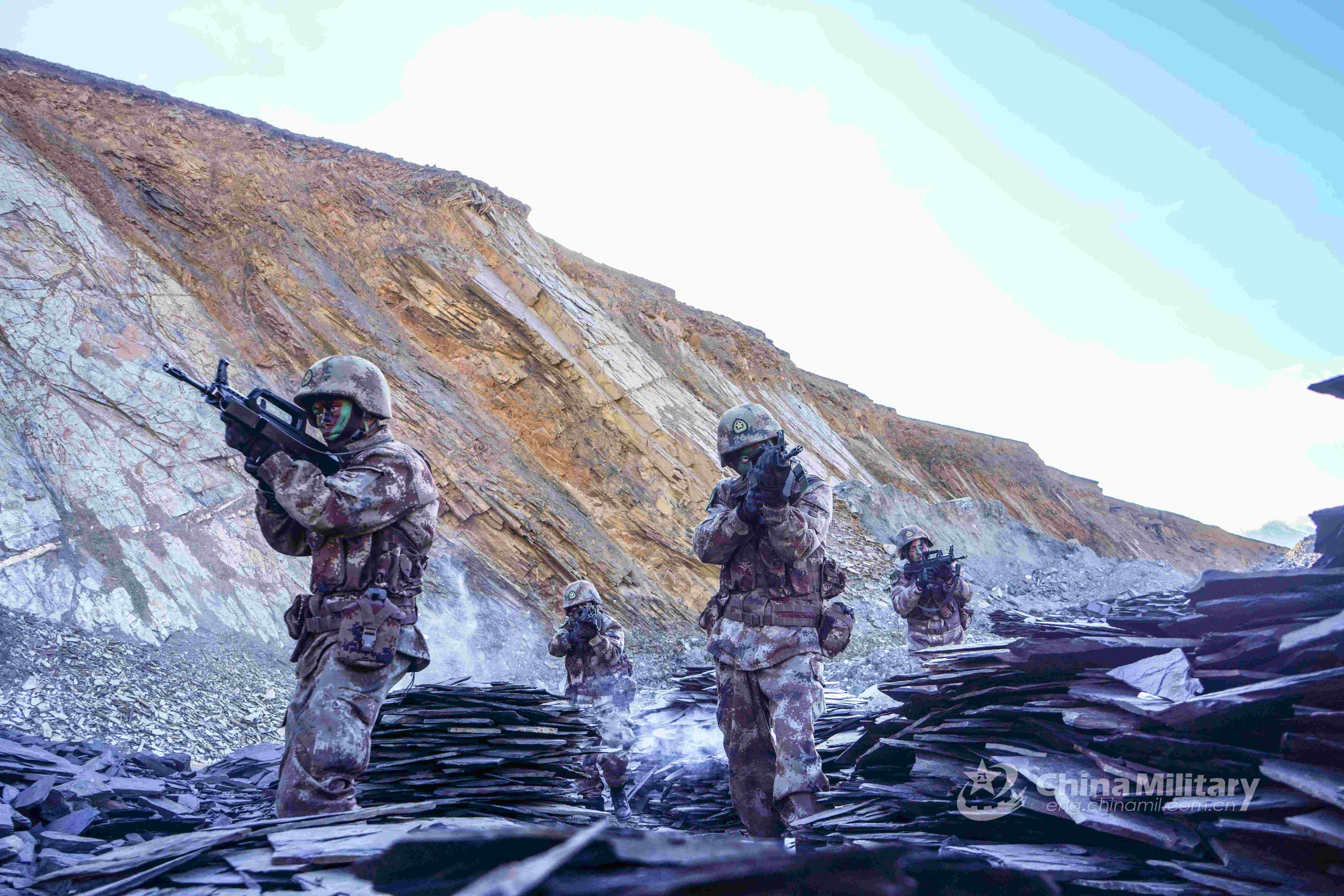 Soldiers assigned to a regiment under the PLA Xinjiang Military Command cover each other in firing position while marching in formation to engage in mock targets during an assault operation in mountainous region on November 8, 2021. (eng.chinamil.com.cn/Photo by Deng Xinyang)