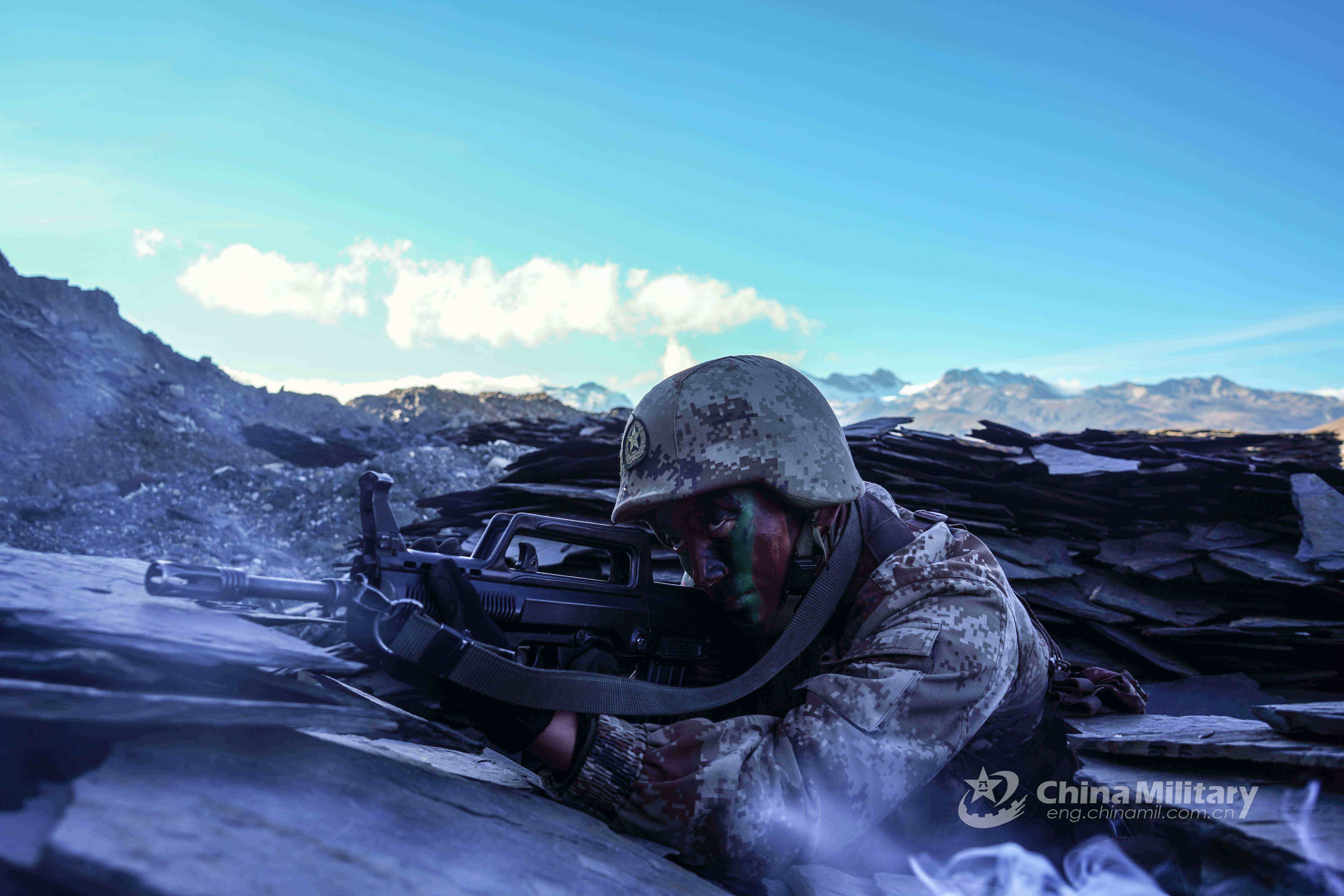 A soldier assigned to a regiment under the PLA Xinjiang Military Command raises his rifle and locks in destination in prone position during an assault operation in mountainous region on November 8, 2021. (eng.chinamil.com.cn/Photo by Deng Xinyang)