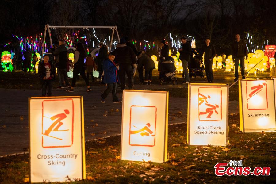 A Winter Olympics-themed Day, featuring a photo exhibition and a lighting ceremony, is held at Snug Harbor Cultural Center &Botanical Garden in New York, Dec. 12, 2021, bringing winter sports pictograms and elements of Beijing Winter Olympics to American citizens. (China News Service/Liao Pan)