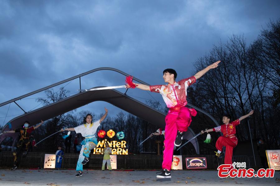 A Winter Olympics-themed Day, featuring a photo exhibition and a lighting ceremony, is held at Snug Harbor Cultural Center &Botanical Garden in New York, Dec. 12, 2021, bringing winter sports pictograms and elements of Beijing Winter Olympics to American citizens. (China News Service/Liao Pan)
