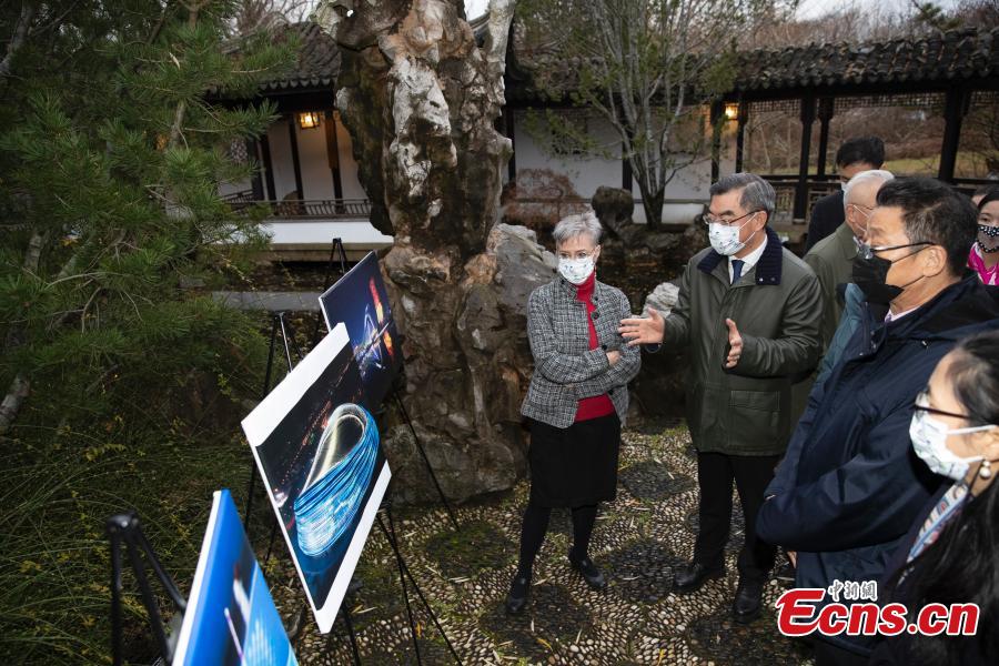 A Winter Olympics-themed Day, featuring a photo exhibition and a lighting ceremony, is held at Snug Harbor Cultural Center &Botanical Garden in New York, Dec. 12, 2021, bringing winter sports pictograms and elements of Beijing Winter Olympics to American citizens. (China News Service/Liao Pan)