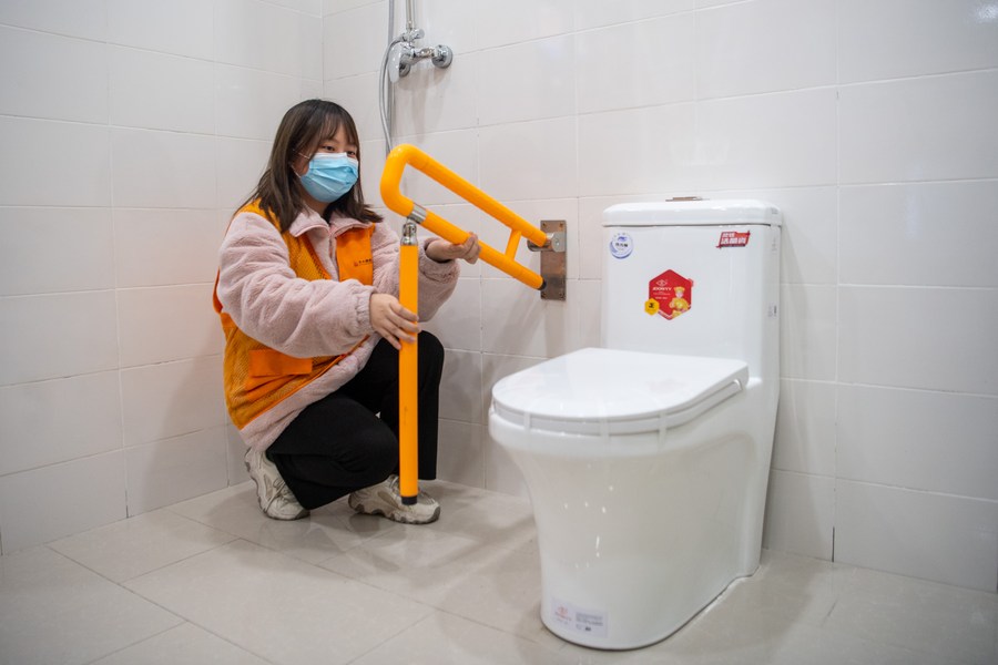 A staff member demonstrates the function of a toilet handle for the elderly in Chongqing, southwest China, Dec. 3, 2021. (Xinhua/Tang Yi)