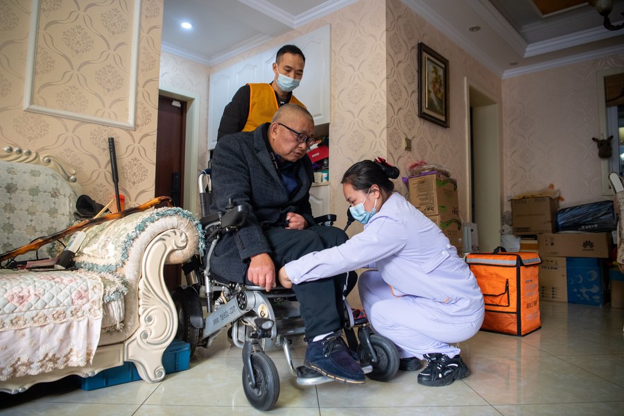 A senior receives care service at home in Chongqing, southwest China, Dec. 2, 2021. (Xinhua/Tang Yi)