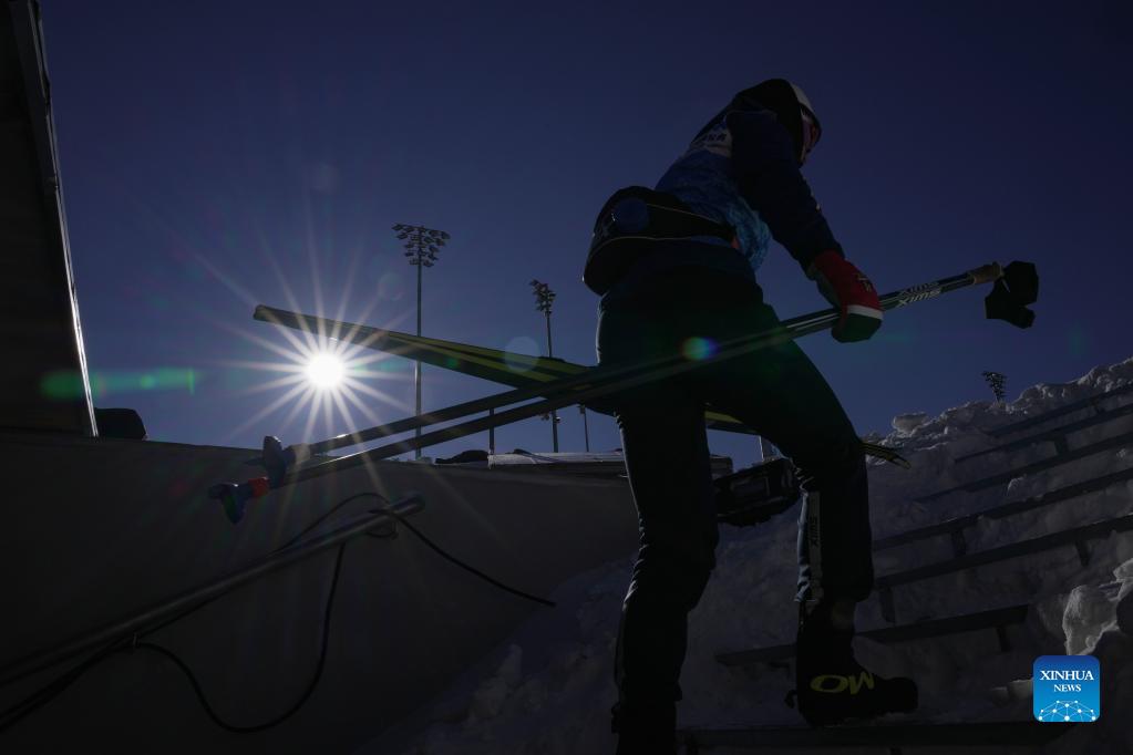 An athlete of Chinese national cross-country skiing team arrives at the training field before a training session preparing for the Beijing 2022 Olympic Winter Games in Zhangjiakou City, north China's Hebei Province, on Dec. 12, 2021. (Xinhua/Hu Huhu)