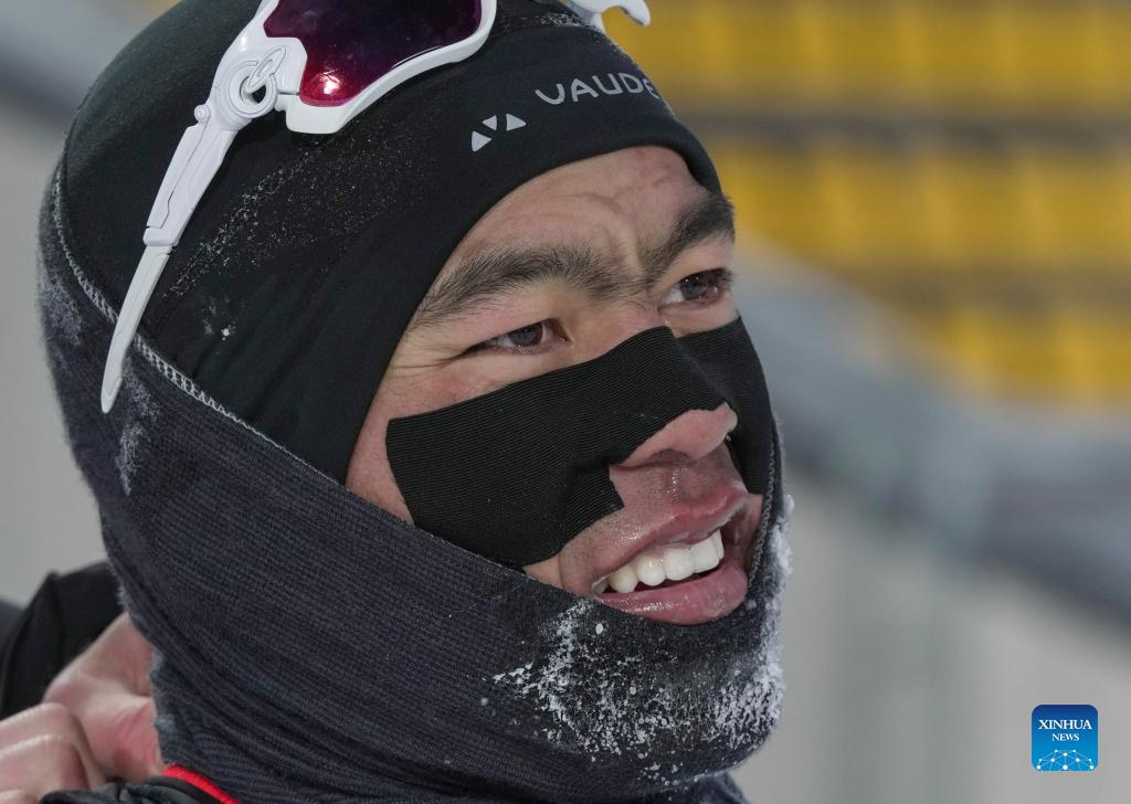 Torsongan Bullik, an athlete of Chinese national cross-country skiing team, looks on after an intra-team simulation competition preparing for the Beijing 2022 Olympic Winter Games in Zhangjiakou City, north China's Hebei Province, on Dec. 12, 2021. (Xinhua/Hu Huhu)