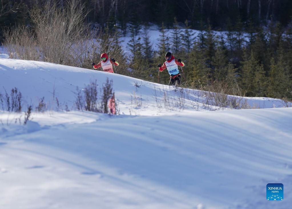Athletes of Chinese national cross-country skiing team take part in a training session preparing for the Beijing 2022 Olympic Winter Games in Zhangjiakou City, north China's Hebei Province, on Dec. 11, 2021. (Xinhua/Hu Huhu)