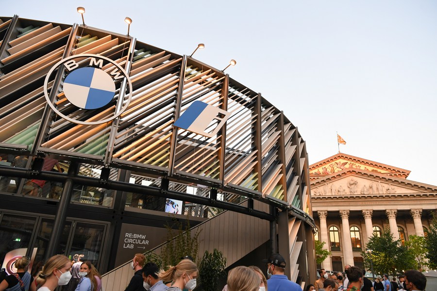 People visit the BMW outdoor booth during the International Motor Show Germany (IAA Mobility) in Munich, Germany, Sept. 8, 2021. (Xinhua/Lu Yang)