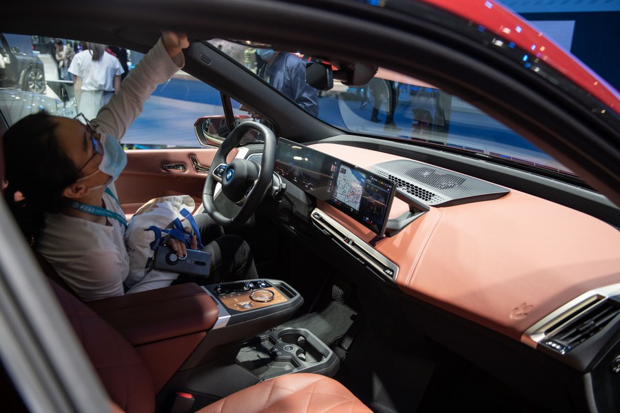 A visitor tries a BMW new energy car at the Automobile Exhibition Area of the 4th China International Import Expo (CIIE) in east China's Shanghai, Nov. 7, 2021. (Xinhua/Meng Tao)