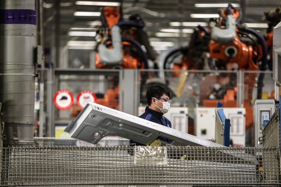 A man works at Tiexi Plant of BMW Brilliance Automotive in Shenyang, capital of northeast China's Liaoning Province, Feb. 17, 2020. (Xinhua/Pan Yulong)