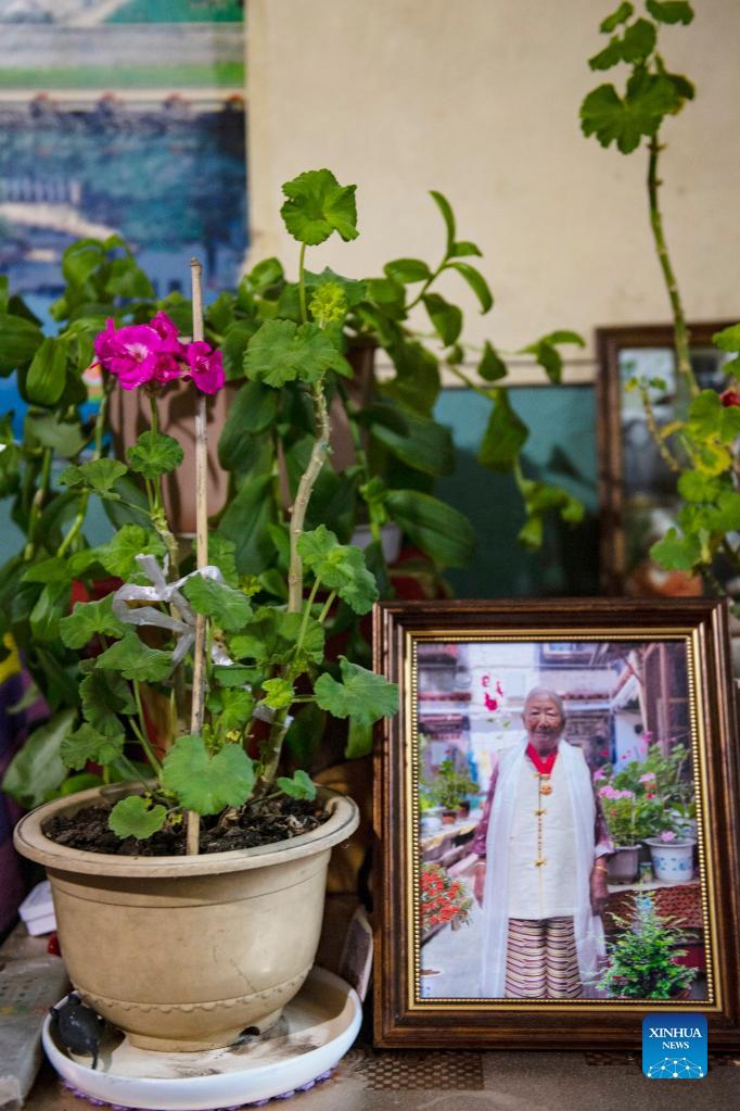 A picture of Migmar Tsamjo is seen at her house in Lhasa, southwest China's Tibet Autonomous Region, Dec. 7, 2021. Migmar Tsamjo was born in 1933. She herded cattle for the serf owner and lived a miserable life in childhood. She fled from the serf owner in 1955, and was later rescued by the People's Liberation Army. She then was sent to Chengdu in southwest China's Sichuan Province and began to study at a college. In 1959, democratic reform was launched and feudal serfdom was finally abolished in Tibet. A million serfs and slaves were emancipated. Recalling bitter days of the past, Tsamjo said that "today's happy life is something I never dreamed about." Tsamjo now lives a happy life with her family in Lhasa. (Xinhua/Sun Ruibo)