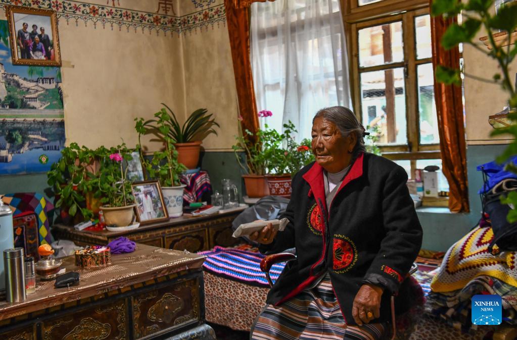 Migmar Tsamjo watches TV at her house in Lhasa, southwest China's Tibet Autonomous Region, Dec. 7, 2021. Migmar Tsamjo was born in 1933. She herded cattle for the serf owner and lived a miserable life in childhood. She fled from the serf owner in 1955, and was later rescued by the People's Liberation Army. She then was sent to Chengdu in southwest China's Sichuan Province and began to study at a college. In 1959, democratic reform was launched and feudal serfdom was finally abolished in Tibet. A million serfs and slaves were emancipated. Recalling bitter days of the past, Tsamjo said that "today's happy life is something I never dreamed about." Tsamjo now lives a happy life with her family in Lhasa. (Xinhua/Jigme Dorje)