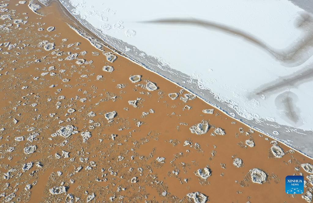Aerial photo taken on Dec. 13, 2021 shows flowing ice on the Yellow River in Ordos, north China's Inner Mongolia Autonomous Region. (Xinhua/Lian Zhen)