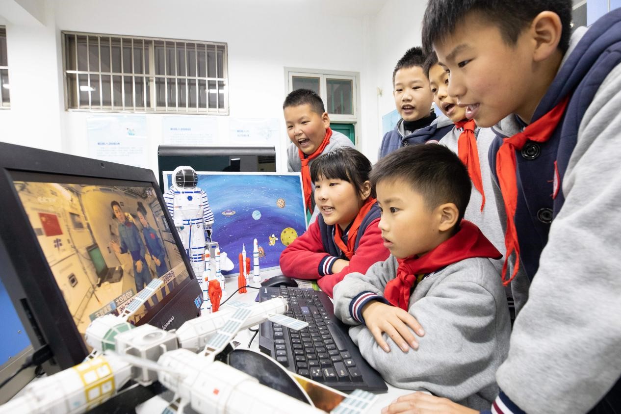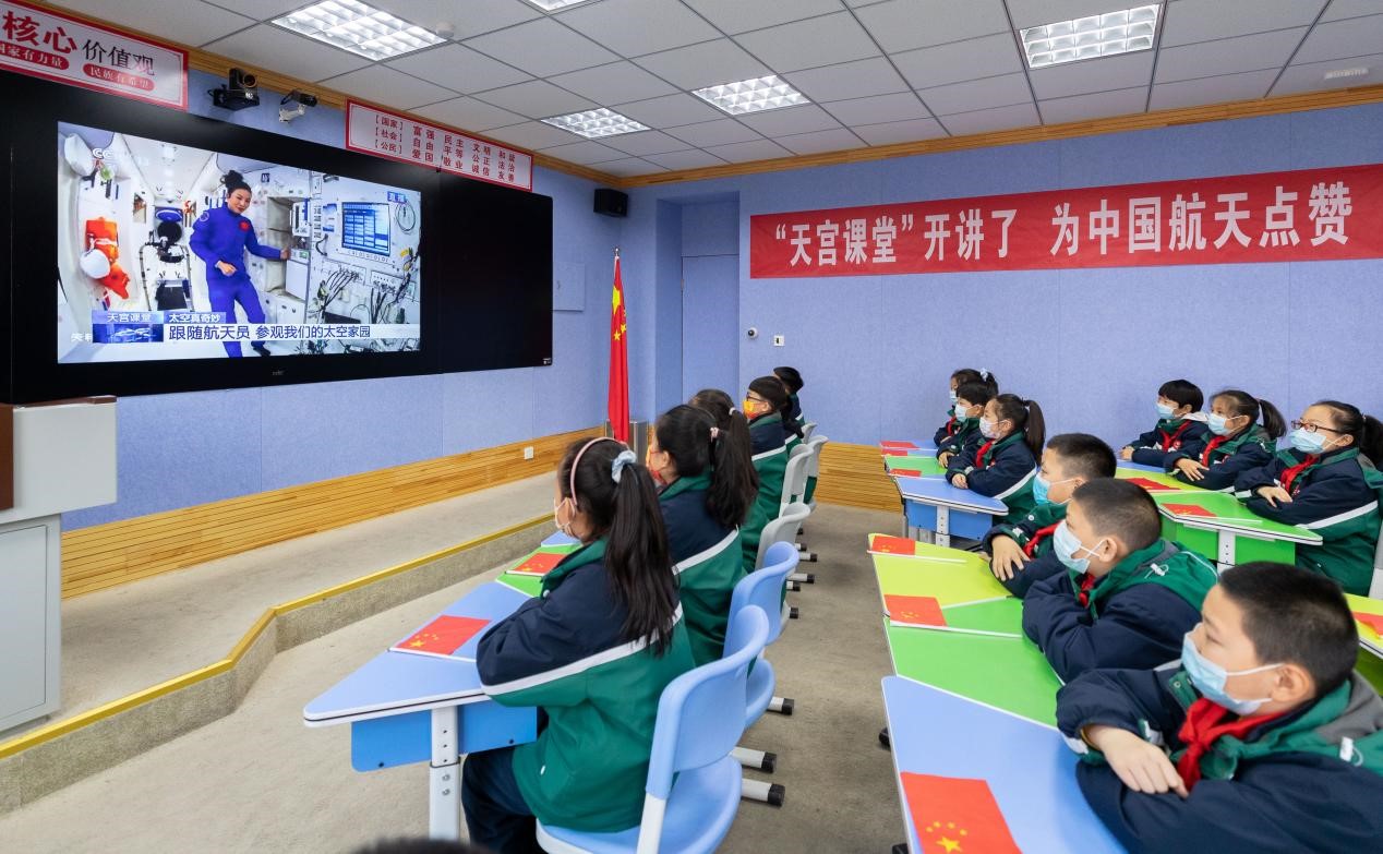 Students of an elementary school in Changxing county, Huzhou city, east China’s Zhejiang province watch a science lecture delivered by crew members of China’s Shenzhou-13 manned spaceflight mission from the country’s space station, Dec. 9, 2021. (People’s Daily Online/Zhou Hongfeng)