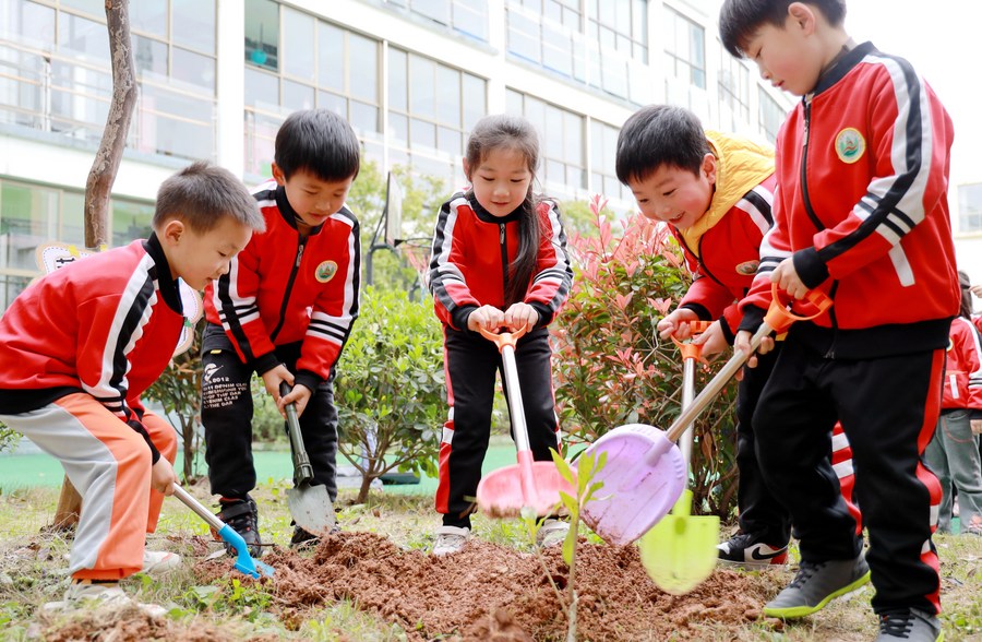 Children plant a sapling at their kindergarten in Ji'an, east China's Jiangxi Province, March 12, 2021. (Photo by Liao Min/Xinhua)