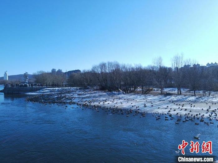 Thousands of water birds are seen roosting at the waterside of Changbai Island on the Songhua River in Jilin city, Northeast China's Jilin province. (China News Service/Cang Yan)