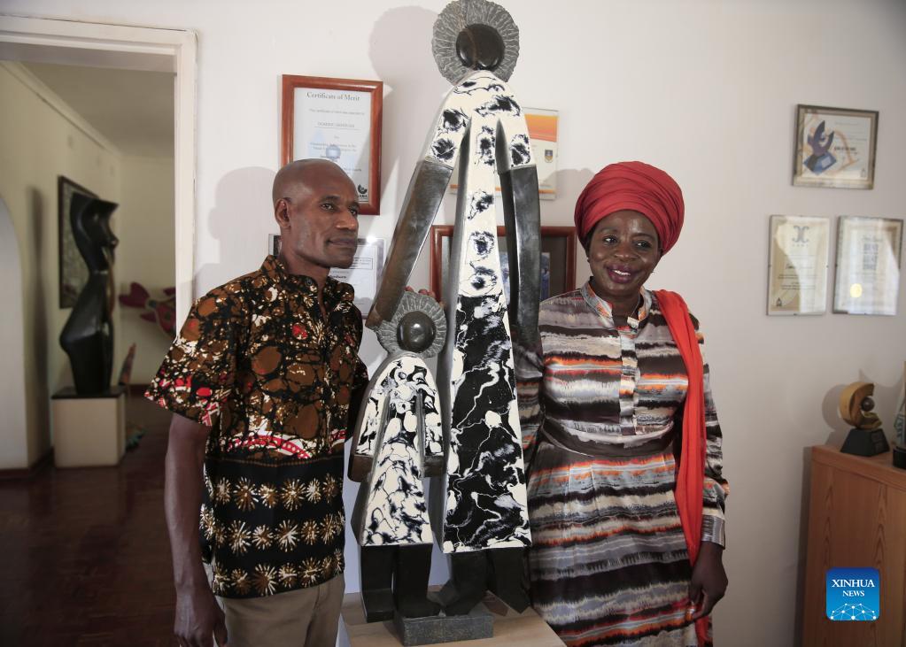 David Ngwerume, one of Zimbabwe's most decorated artists, who is known for his pandemic-inspired art, shows his artwork to Zimbabwe's Acting Minister of Youth, Sport, Arts and Recreation Sekai Nzenza at his studio in Harare, Zimbabwe, Dec. 9, 2021. Two of Zimbabwe's renowned stone sculptors will showcase their talent at the 9th Beijing International Art Biennale which will start next month. The Beijing International Art Biennale, which has taken place since 2002, promotes global harmony through contemporary artwork exhibitions. (Photo by Shaun Jusa/Xinhua)