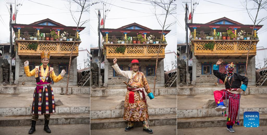 Combo photo taken on Nov. 25, 2021 shows three Tibetan Opera actors posing for pictures in Zhentang Town of Xigaze, southwest China's Tibet Autonomous Region. Situated deep in the Himalayas, a small town called Zhentang in Tibet's Dinggye County is one of the settlements for the Sherpa. The border town has an average elevation of 2,000 meters. In recent years, great changes have taken place in Zhentang. A series of infrastructure projects have been put into use. Besides, Zhentang is also focusing on the development of cross-border trade, aquaculture, tourism and processing industry with local features to increase the income of villagers. In 2020, the per capita disposable income of local residents in Zhentang reached 10,679 yuan (about 1,679 U.S. dollars). (Xinhua/Sun Ruibo)