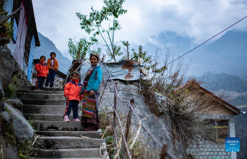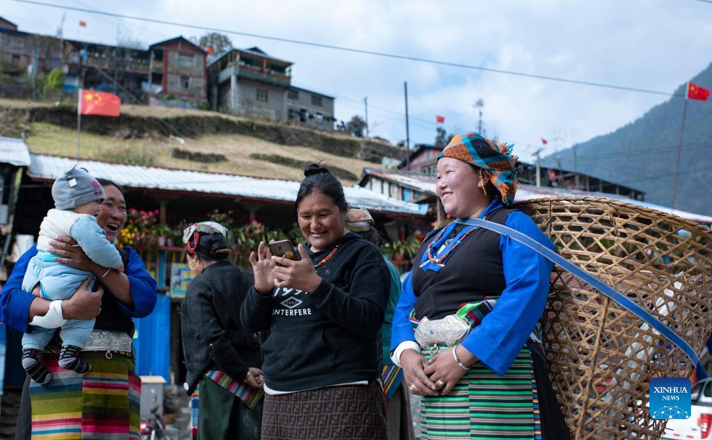 Sherpa women talk with each other at a square in their village in Zhentang Town of Xigaze, southwest China's Tibet Autonomous Region on Nov. 24, 2021. Situated deep in the Himalayas, a small town called Zhentang in Tibet's Dinggye County is one of the settlements for the Sherpa. The border town has an average elevation of 2,000 meters. In recent years, great changes have taken place in Zhentang. A series of infrastructure projects have been put into use. Besides, Zhentang is also focusing on the development of cross-border trade, aquaculture, tourism and processing industry with local features to increase the income of villagers. In 2020, the per capita disposable income of local residents in Zhentang reached 10,679 yuan (about 1,679 U.S. dollars). (Xinhua/Purbu Zhaxi)