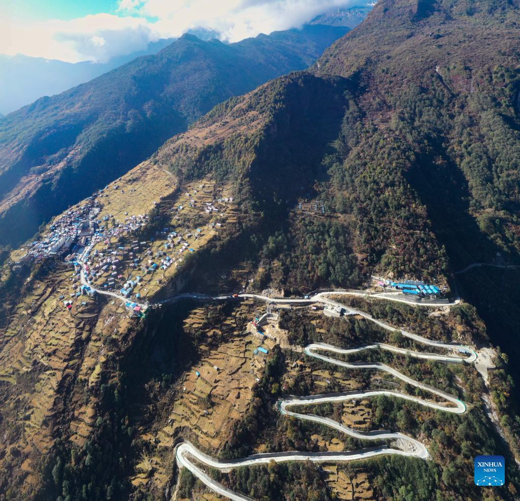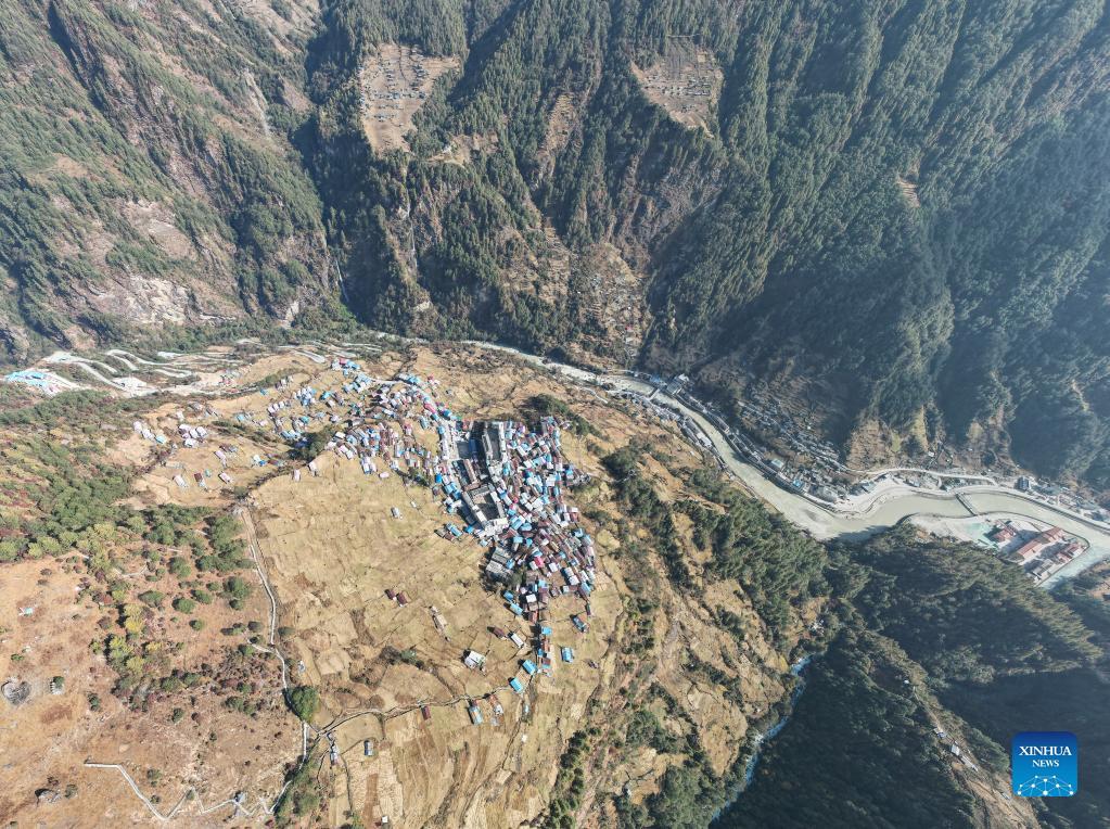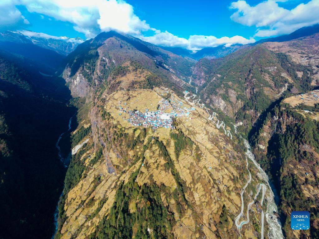 Aerial photo taken on Nov. 27, 2021 shows the view of Zhentang Town in Xigaze, southwest China's Tibet Autonomous Region. Situated deep in the Himalayas, a small town called Zhentang in Tibet's Dinggye County is one of the settlements for the Sherpa. The border town has an average elevation of 2,000 meters. In recent years, great changes have taken place in Zhentang. A series of infrastructure projects have been put into use. Besides, Zhentang is also focusing on the development of cross-border trade, aquaculture, tourism and processing industry with local features to increase the income of villagers. In 2020, the per capita disposable income of local residents in Zhentang reached 10,679 yuan (about 1,679 U.S. dollars). (Xinhua/Purbu Zhaxi)