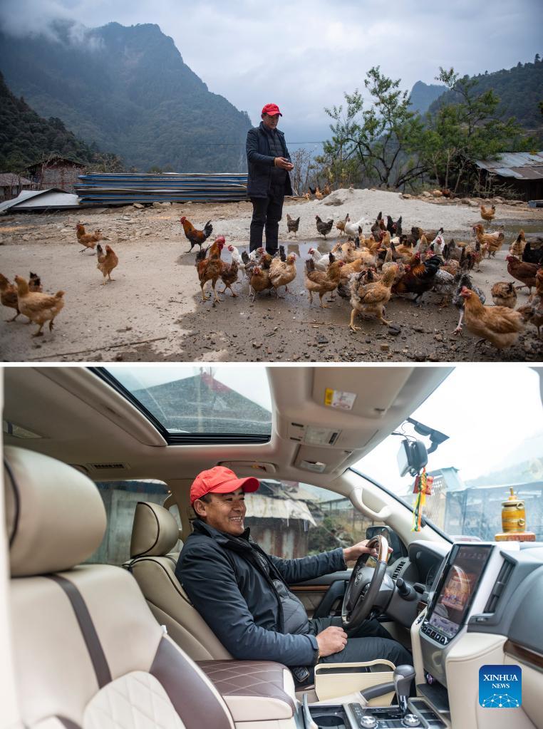 Combo photo taken on Nov. 25, 2021 shows Lhapa Tagye feeds chickens in his chicken farm (top) and Lhapa Tagye sits in his car bought after he opened the farm, in Zhentang Town of Xigaze, southwest China's Tibet Autonomous Region. Situated deep in the Himalayas, a small town called Zhentang in Tibet's Dinggye County is one of the settlements for the Sherpa. The border town has an average elevation of 2,000 meters. In recent years, great changes have taken place in Zhentang. A series of infrastructure projects have been put into use. Besides, Zhentang is also focusing on the development of cross-border trade, aquaculture, tourism and processing industry with local features to increase the income of villagers. In 2020, the per capita disposable income of local residents in Zhentang reached 10,679 yuan (about 1,679 U.S. dollars). (Xinhua/Sun Ruibo)