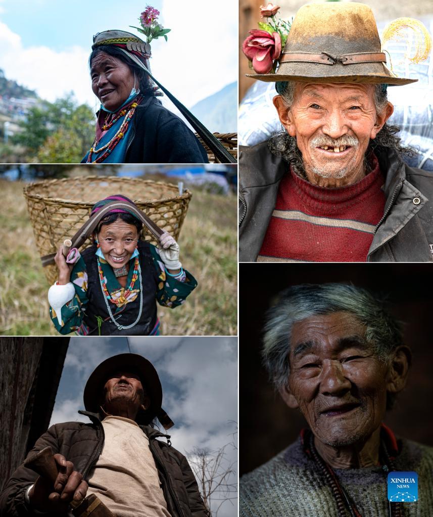 Combo photo taken on Nov. 24, 2021 shows Sherpa villagers in Zhentang Town of Xigaze, southwest China's Tibet Autonomous Region. Situated deep in the Himalayas, a small town called Zhentang in Tibet's Dinggye County is one of the settlements for the Sherpa. The border town has an average elevation of 2,000 meters. In recent years, great changes have taken place in Zhentang. A series of infrastructure projects have been put into use. Besides, Zhentang is also focusing on the development of cross-border trade, aquaculture, tourism and processing industry with local features to increase the income of villagers. In 2020, the per capita disposable income of local residents in Zhentang reached 10,679 yuan (about 1,679 U.S. dollars). (Xinhua/Purbu Zhaxi)