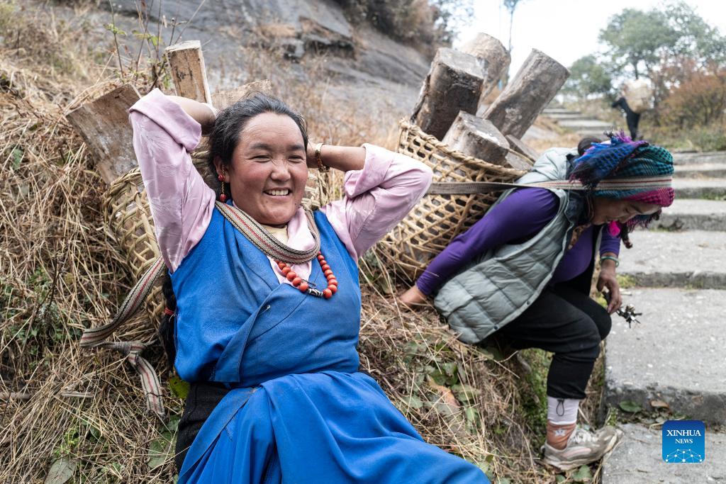 Sherpa women carry supplies uphill in Zhentang Town of Xigaze, southwest China's Tibet Autonomous Region, Nov. 24, 2021. Situated deep in the Himalayas, a small town called Zhentang in Tibet's Dinggye County is one of the settlements for the Sherpa. The border town has an average elevation of 2,000 meters. In recent years, great changes have taken place in Zhentang. A series of infrastructure projects have been put into use. Besides, Zhentang is also focusing on the development of cross-border trade, aquaculture, tourism and processing industry with local features to increase the income of villagers. In 2020, the per capita disposable income of local residents in Zhentang reached 10,679 yuan (about 1,679 U.S. dollars). (Xinhua/Sun Ruibo)