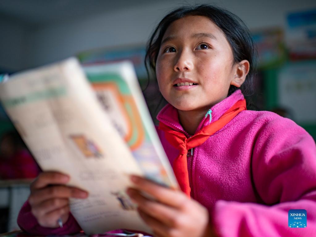 Third-year primary school student Wangmo reads a textbook in class in Zhentang Town of Xigaze, southwest China's Tibet Autonomous Region, Nov. 24, 2021. Situated deep in the Himalayas, a small town called Zhentang in Tibet's Dinggye County is one of the settlements for the Sherpa. The border town has an average elevation of 2,000 meters. In recent years, great changes have taken place in Zhentang. A series of infrastructure projects have been put into use. Besides, Zhentang is also focusing on the development of cross-border trade, aquaculture, tourism and processing industry with local features to increase the income of villagers. In 2020, the per capita disposable income of local residents in Zhentang reached 10,679 yuan (about 1,679 U.S. dollars). (Xinhua/Purbu Zhaxi)