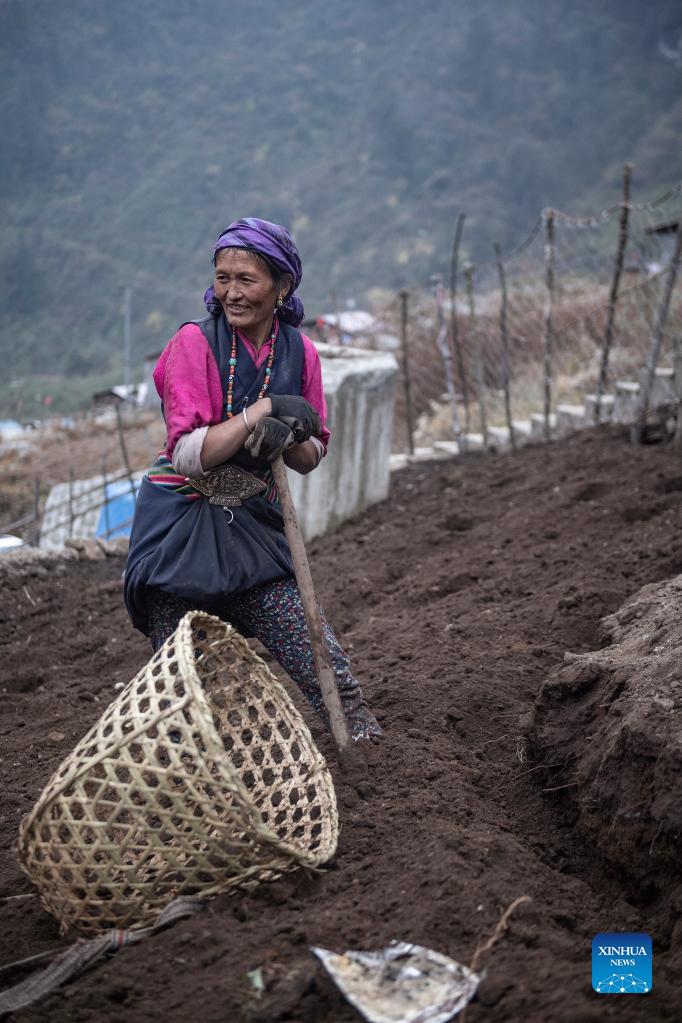 A Sherpa woman works in the field in Zhentang Town of Xigaze, southwest China's Tibet Autonomous Region, Nov. 26, 2021. Situated deep in the Himalayas, a small town called Zhentang in Tibet's Dinggye County is one of the settlements for the Sherpa. The border town has an average elevation of 2,000 meters. In recent years, great changes have taken place in Zhentang. A series of infrastructure projects have been put into use. Besides, Zhentang is also focusing on the development of cross-border trade, aquaculture, tourism and processing industry with local features to increase the income of villagers. In 2020, the per capita disposable income of local residents in Zhentang reached 10,679 yuan (about 1,679 U.S. dollars). (Xinhua/Sun Ruibo)