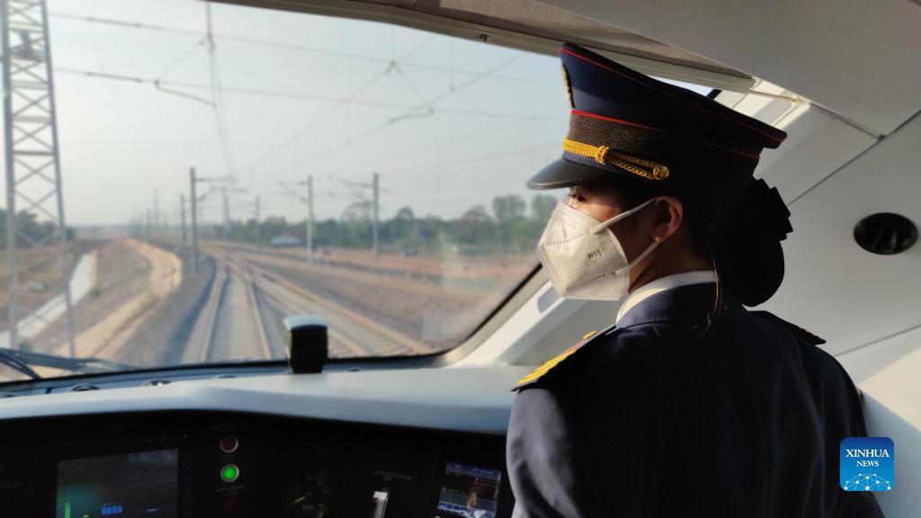 Sida Phengphongsawanh, a trainee driver, gets trained on Lane Xang electric multiple unit (EMU) train of the China-Laos Railway in Laos, Nov. 30, 2021. The China-Laos Railway created more than 110,000 jobs for Lao people during its construction. Since the railway's construction was launched, the project has drawn the interest of numerous local young talents who pursued their professional career on the railway, and many of them have grown into railway engineering masters. (Photo by Li Huan/Xinhua)