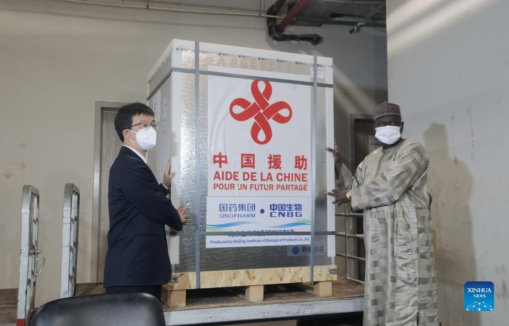 Chinese Ambassador to Niger Jiang Feng (L) and Niger's Health Minister Idi Illiassou Mainassara attend the handover ceremony of the second batch of COVID-19 vaccine from China at Niamey International Airport in Niamey, Niger, Dec. 13, 2021. (Xinhua)