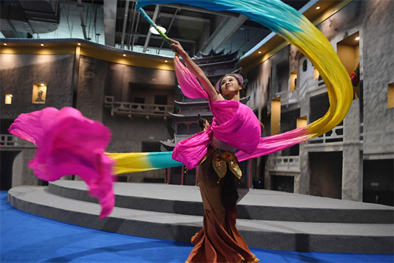A performer dances at an exhibition of the duplications of Dunhuang overseas fine cultural relics in Dunhuang city, Northwest China's Gansu province, Sept 24, 2021. (Photo/Xinhua)