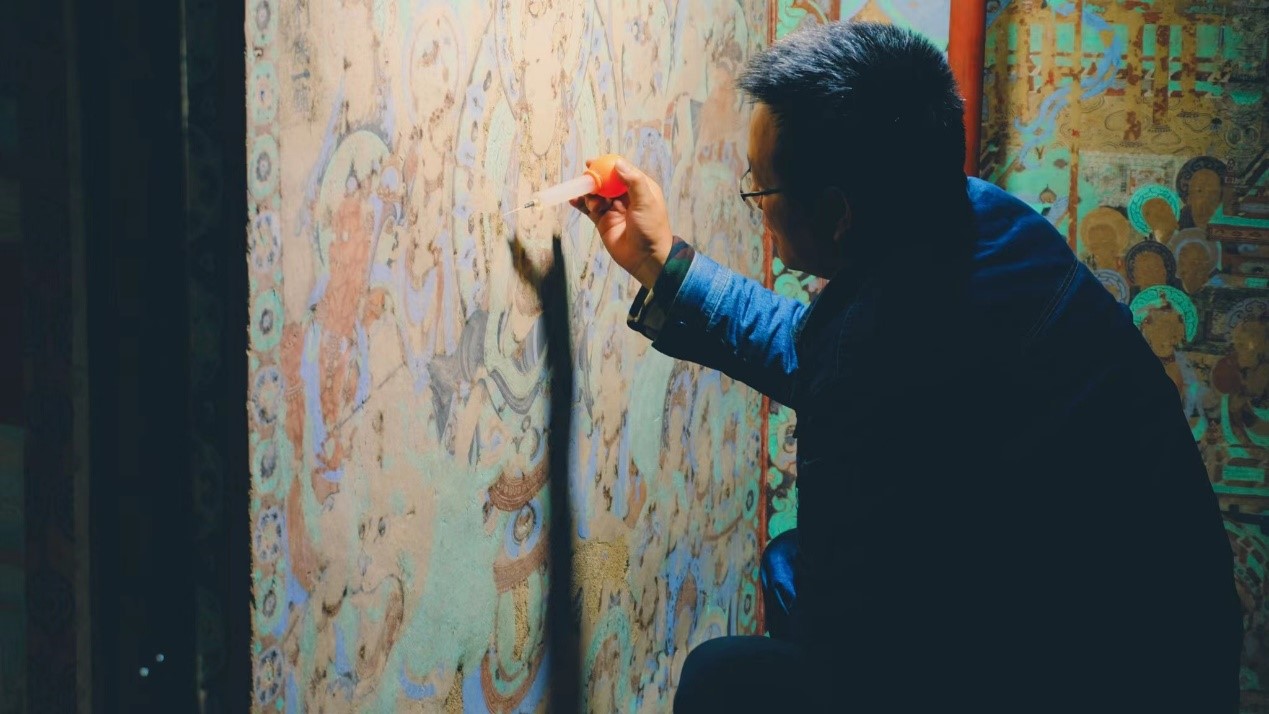 Photo taken on Oct.15, 2021 shows a cultural relic conservation expert from the Dunhuang Academy restoring a mural at Mogao Grottoes in Dunhuang, northwest China’s Gansu Province. (People's Daily Online/Lv Qiang)