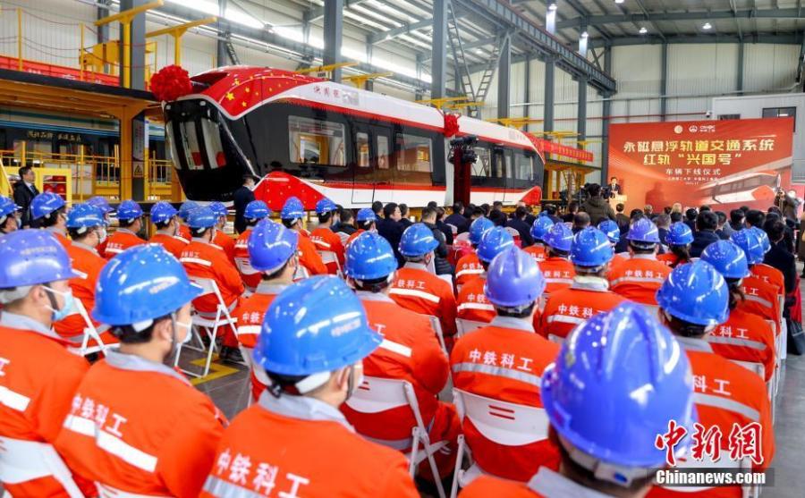 Photo shows the rolling-off-production-line ceremony of the Xingguo maglev sky train in Jiangxia District in Wuhan, central China's Hubei Province, Dec. 14, 2021. (Photo: China News Service/Zhang Chang)
