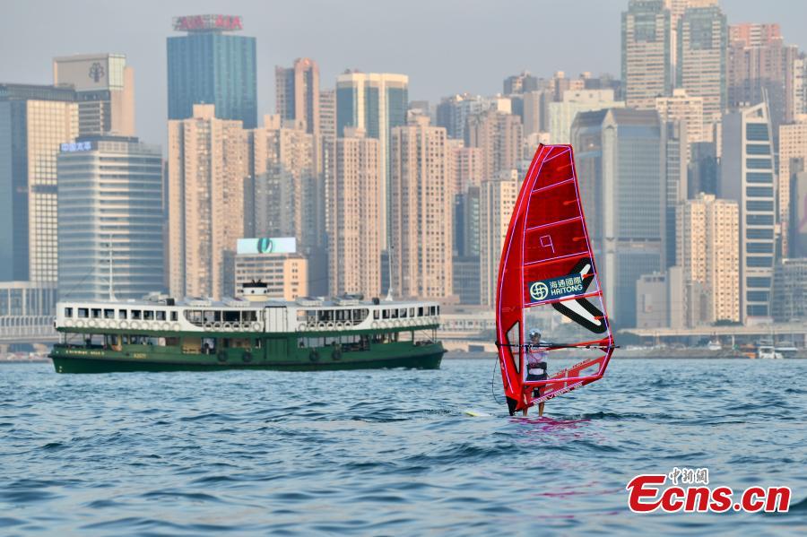 A windsurfer surfs in Victoria Harbour in Hong Kong Special Administrative Region, Dec. 14, 2021. (Photo: China News Service/Li Zhihua)