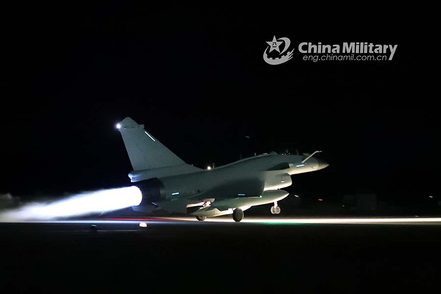 A J-10 fighter jet attached to an aviation brigade of the air force under the PLA Southern Theater Command takes off during a trans-regional flight mission aiming to test the troop’s long-range combat capability in late November, 2021. (eng.chinamil.com.cn/Photo by Huang Rongkai)