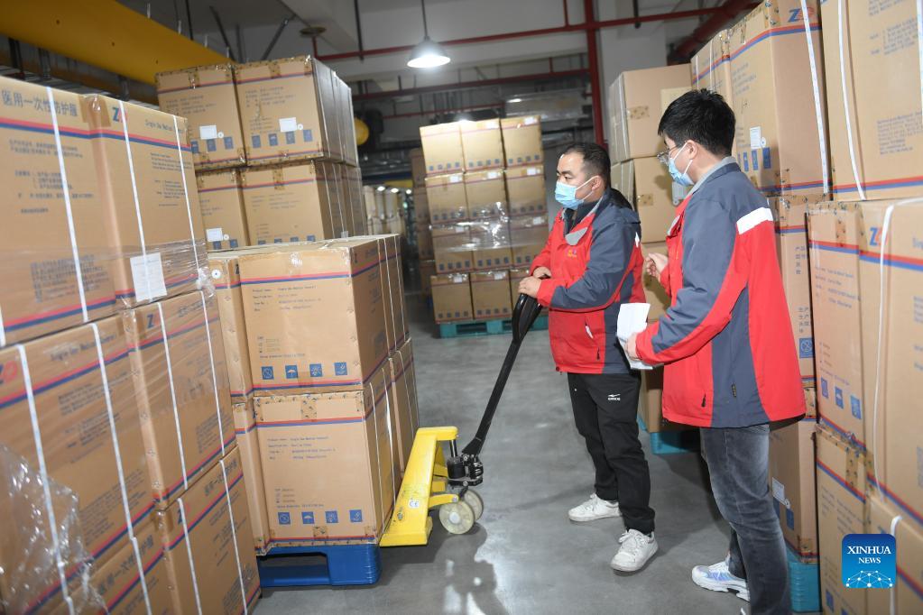 Staff members count epidemic prevention materials in Shangyu District of Shaoxing City, east China's Zhejiang Province, Dec. 15, 2021. Shangyu District of Shaoxing has taken measures to ensure the supply of daily necessities for residents following a recent COVID-19 resurgence. (Xinhua/Weng Xinyang)