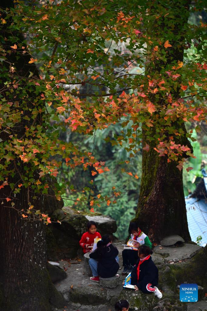 Students read books at the teaching point of Wuying Village, which lies on the border between south China's Guangxi Zhuang Autonomous Region and southwest China's Guizhou Province, on Dec. 15, 2021. With the support of Lianjiang City of Guangdong Province, the teaching point began to renovate classrooms, enrich libraries and build new toilets for a better studying environment. (Xinhua/Huang Xiaobang)