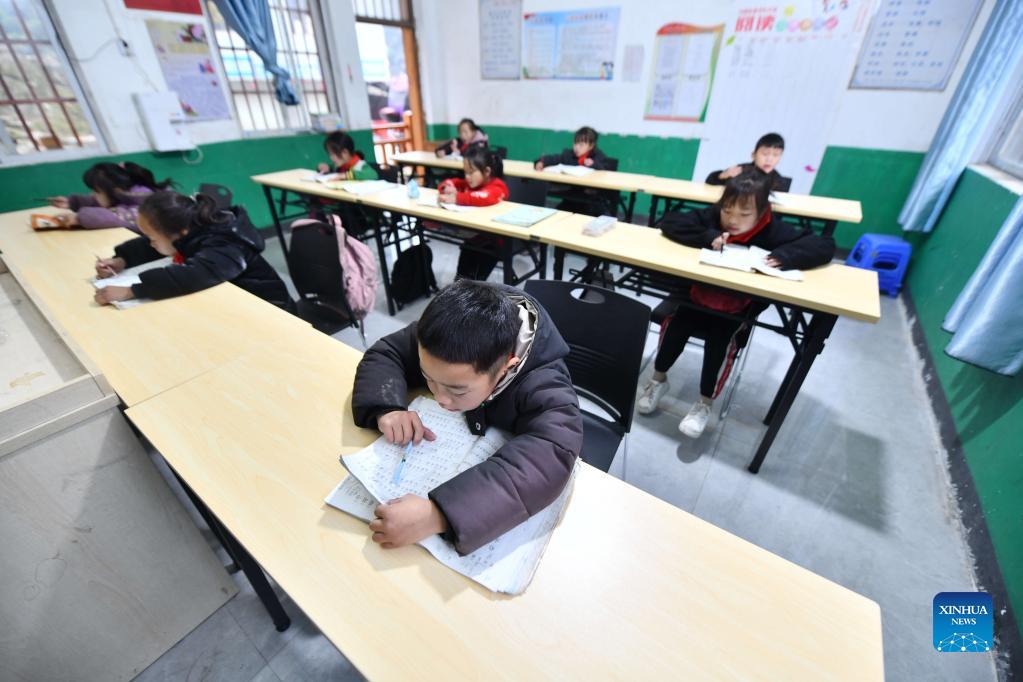 Students study at a renovated classroom of the teaching point at Wuying Village, which lies on the border between south China's Guangxi Zhuang Autonomous Region and southwest China's Guizhou Province, on Dec. 15, 2021. With the support of Lianjiang City of Guangdong Province, the teaching point began to renovate classrooms, enrich libraries and build new toilets for a better studying environment. (Xinhua/Huang Xiaobang)