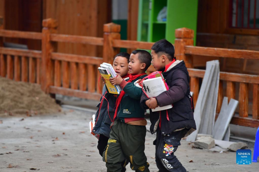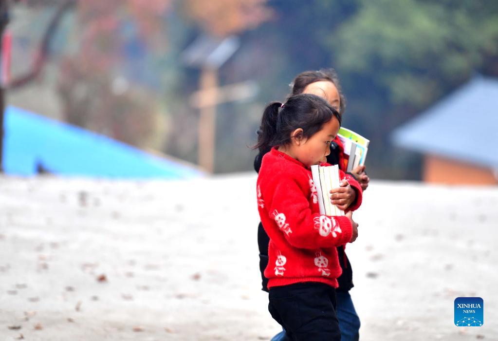 Students read new books at the teaching point of Wuying Village, which lies on the border between south China's Guangxi Zhuang Autonomous Region and southwest China's Guizhou Province, on Dec. 15, 2021. With the support of Lianjiang City of Guangdong Province, the teaching point began to renovate classrooms, enrich libraries and build new toilets for a better studying environment. (Xinhua/Huang Xiaobang)