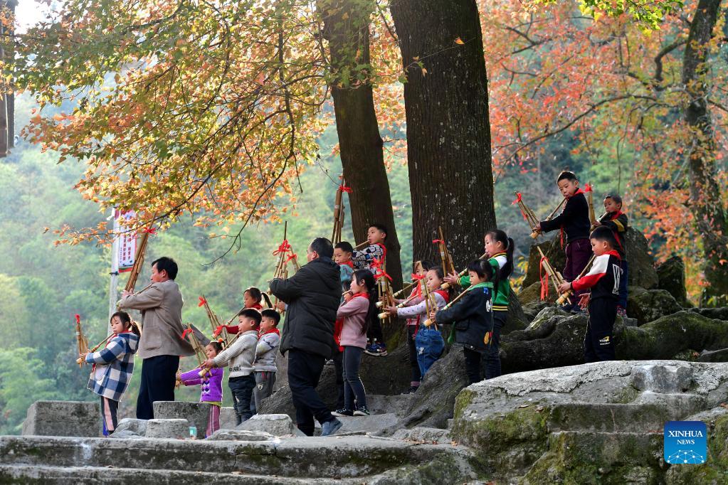 Students blow Lusheng, a reed-pipe wind instrument, at the teaching point of Wuying Village, which lies on the border between south China's Guangxi Zhuang Autonomous Region and southwest China's Guizhou Province, on Dec. 14, 2021. With the support of Lianjiang City of Guangdong Province, the teaching point began to renovate classrooms, enrich libraries and build new toilets for a better studying environment. (Xinhua/Huang Xiaobang)
