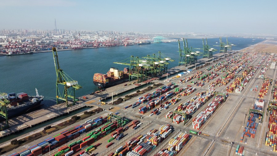Aerial photo taken on Jan. 11, 2021 shows a view of the Pacific international container terminal at Tianjin Port in north China's Tianjin Municipality. (Xinhua/Zhao Zishuo)