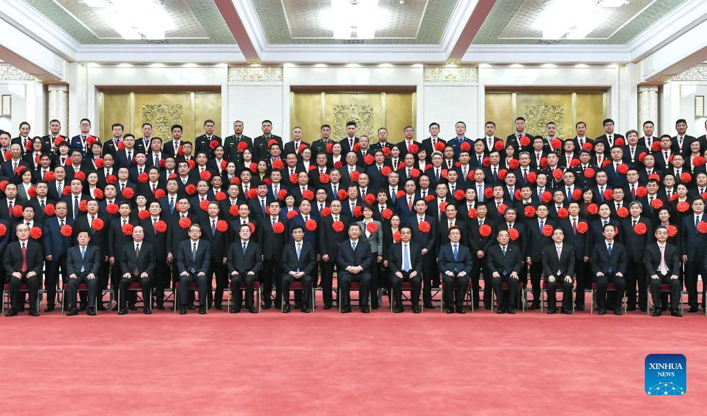 Chinese President Xi Jinping, also general secretary of the Communist Party of China (CPC) Central Committee and chairman of the Central Military Commission, meets with representatives of a meeting commending role models in implementing the Peaceful China initiative at the Great Hall of the People in Beijing, capital of China, Dec. 15, 2021. Li Keqiang, Wang Huning and Han Zheng, who are members of the Standing Committee of the Political Bureau of the CPC Central Committee, attended the event. (Xinhua/Xie Huanchi)