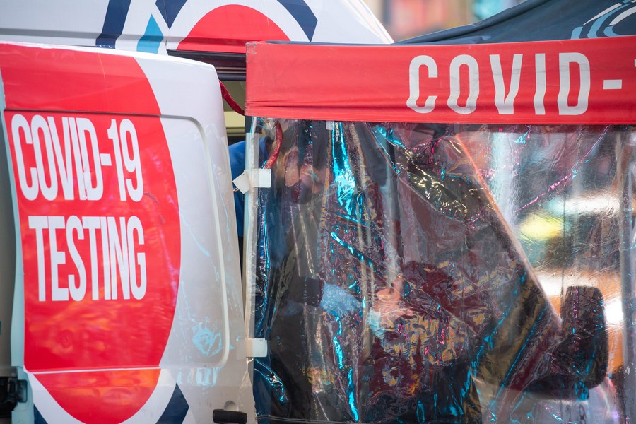 A person is tested for COVID-19 on the Times Square in New York, the United States, Dec. 14, 2021.(Photo by Michael Nagle/Xinhua)